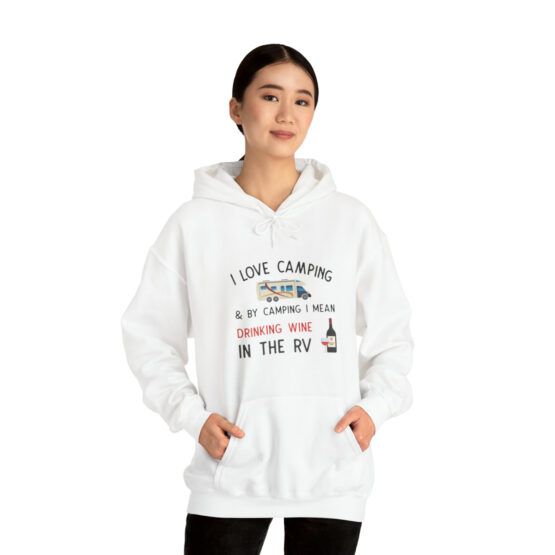 Funny Hooded Sweatshirt, with the quote “I love camping & by camping, I mean drinking wine in the RV”.