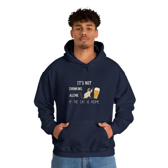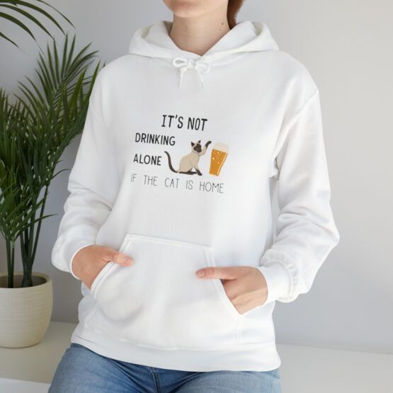 Funny Hooded Sweatshirt for pet lovers, with the quote “It’s not drinking alone if the cat is home”.