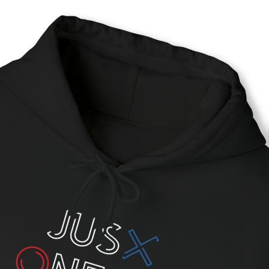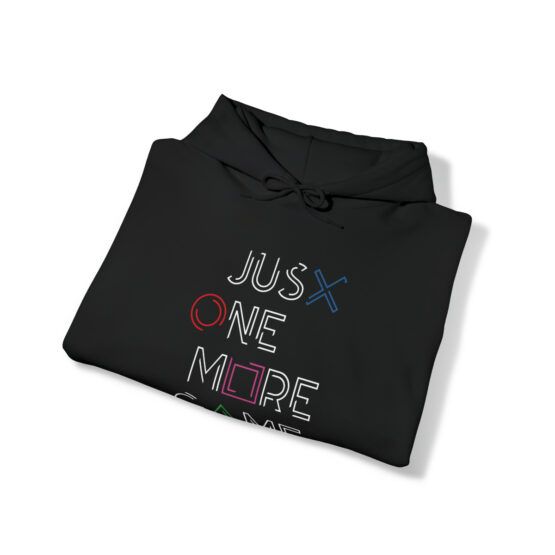 Funny Hooded Sweatshirt for Gamers, with the quote “Just one more game”.