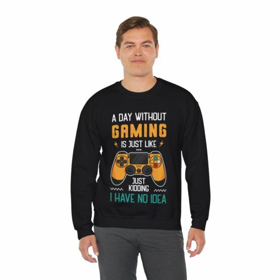 Funny Crewneck Sweatshirt for Gamers, with the quote “A day without gaming is just like, just kidding I have no idea”.