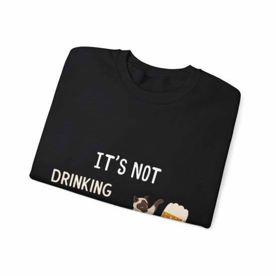 Funny Crewneck Sweatshirt with the quote “It’s not drinking alone if the cat is home”.